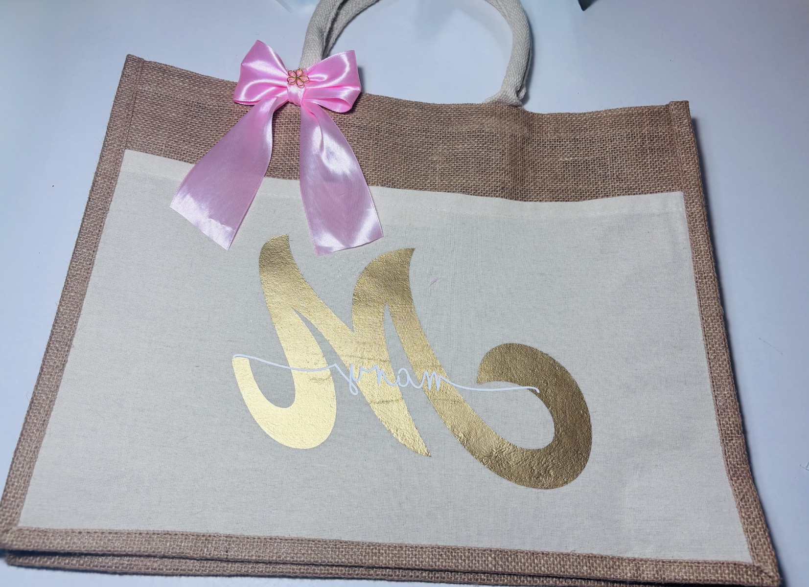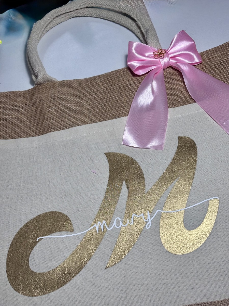 Vinil textil rosa y dorado: Decorado con detalles de vinil textil de color rosa suave y dorado brillante, dándole un aspecto fresco y moderno.