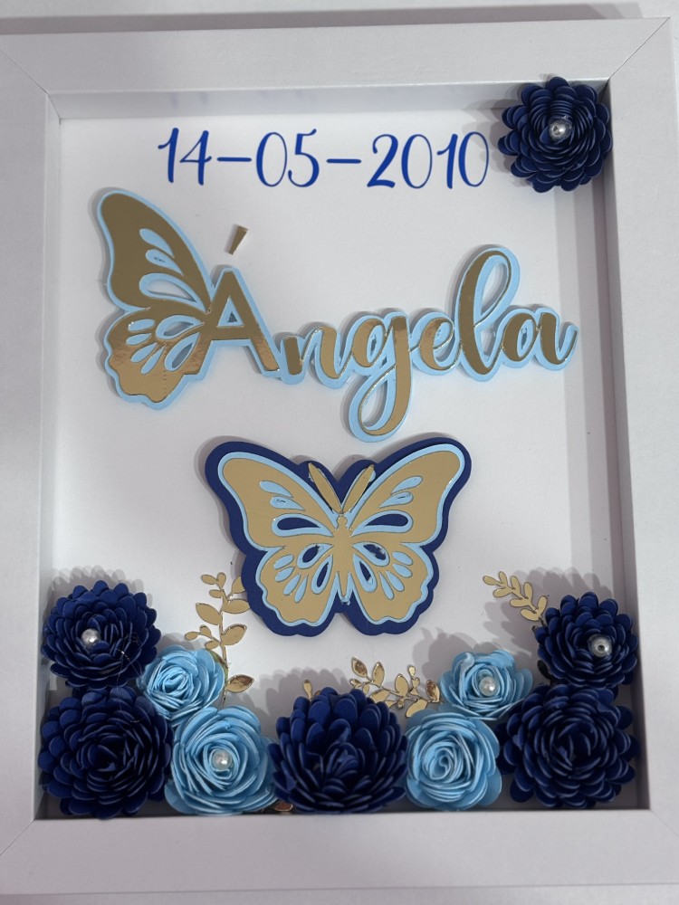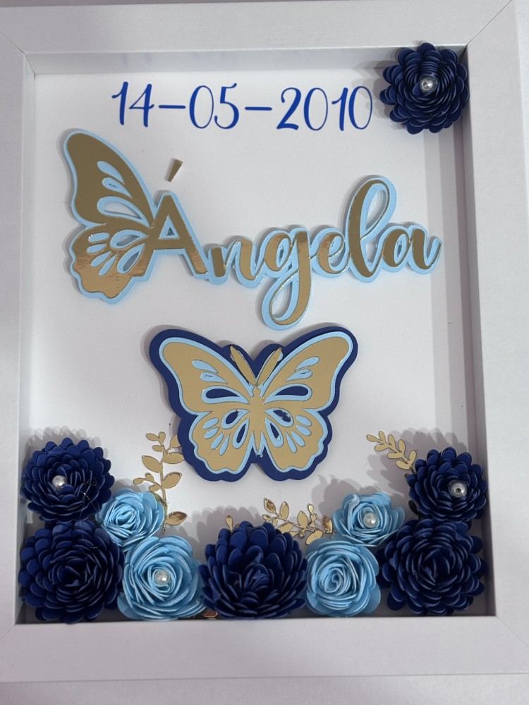 Este cuadro personalizado es una pieza decorativa única, ideal para darle un toque personal a cualquier rincón de la casa. En tonos azules suaves, se puede personalizar con el nombre y la fecha de nacimiento utilizando vinil permanente, creando una pieza especial que resalta por su elegancia y originalidad. Su tamaño compacto lo convierte en una excelente opción para espacios pequeños, como mesas de noche, escritorios o estanterías.